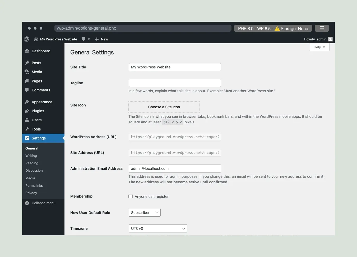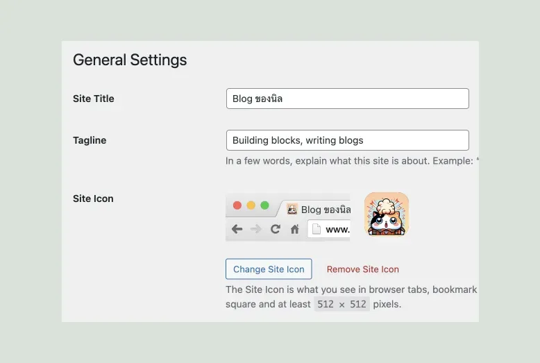 Section titled “การตั้งค่าทั่วไปของเว็บไซต์ (ชื่อ, Tagline, Icon)”ในส่วนแรกนิลจะพูดถึงพวกการตั้งค่าทั่วไป นึกถึงเวลาที่เราเข้าเว็บไซต์แล้วจะเห็น Icon/Logo ของเว็บไซต์ และก็ชื่อในแถบของ Browser ใช่ไหมล่ะครับ ของพวกนั้นสามารถตั้งค่าได้ในเมนู Settings > General ครับ พอทุกคนเข้ามาแล้วก็จะเจอหน้าตาตั้งค่าแบบนี้ นิลจะขออธิบายตั้งค่าที่สำคัญ ๆ นะครับ
