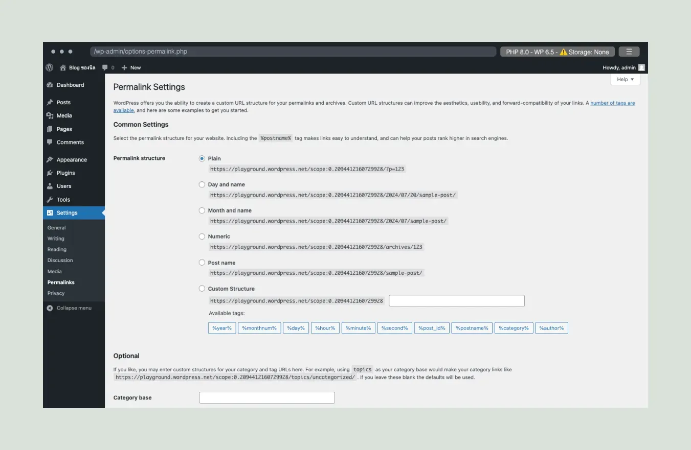 - Post name: ใช้ชื่อบทความอย่างเดียว เช่น https://example.com/sample-post/