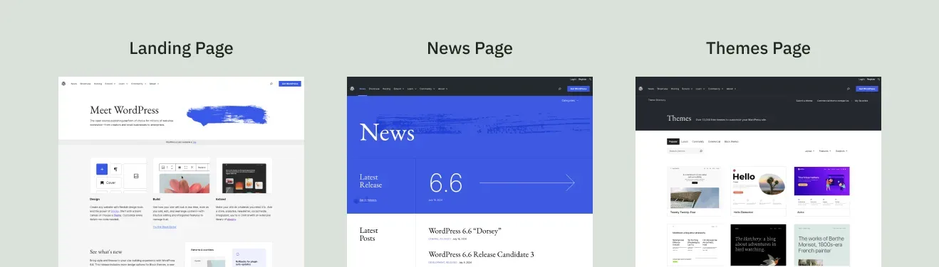 Section titled “การเลือก Template เพื่อใช้แสดงผล Post/Page ต่าง ๆ”ส่วนสุดท้ายที่นิลจะพูดถึงคือเรื่องของการแสดงผลของ Post/Page ด้วย Layout ที่ต่างกันครับ ลองนึกภาพตามนะครับเรามีหน้าที่เป็นหน้าแรกกับหน้าที่เป็นหน้าแสดง Post ทั้งหมดในระบบดูครับว่ามี Layout เหมือนกันไหม? คำตอบคืออาจจะเหมือนหรือไม่เหมือนก็ได้ ซึ่งในเคสส่วนใหญ่จะไม่เหมือนกันแหละครับ เดี๋ยวนิลจะยกตัวอย่างให้ดูแบบไว ๆ นะครับ ขอยกตัวอย่างหน้าต่าง ๆ ของเว็บ WordPress.org นะครับ